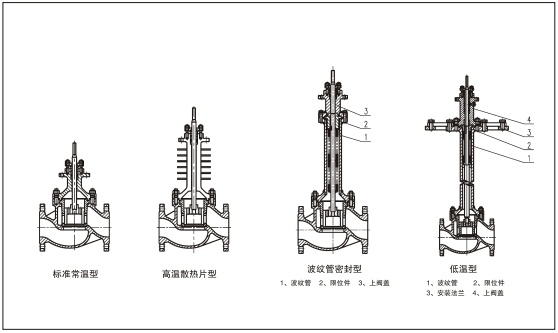 | 系列類型 | 常溫型、中溫型、低溫型。波紋管密封型、夾套保溫型、調(diào)節(jié)切斷型 | ||||||||||||||||||||||||||||