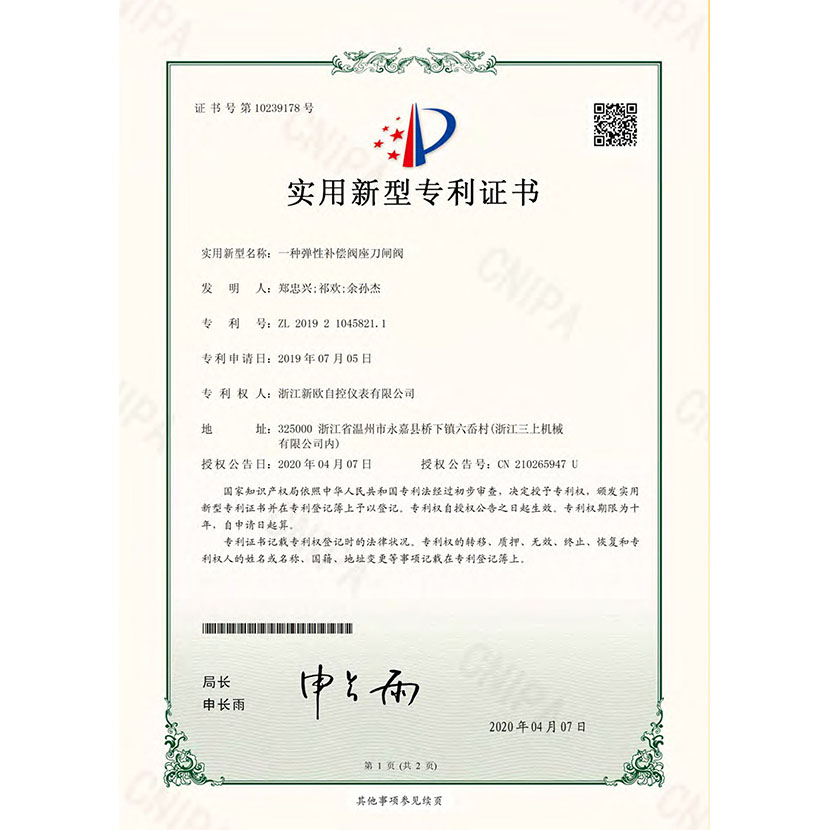 一種彈性補償閥座刀閘閥 專利證書