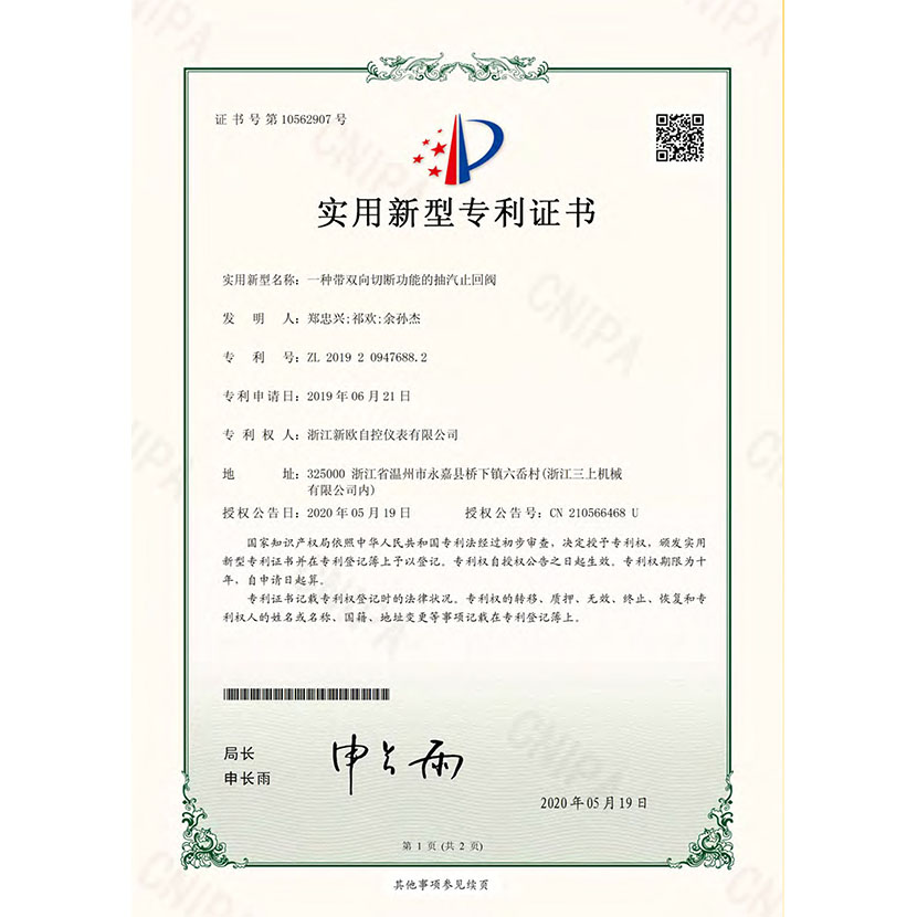 一種帶雙向切斷功能的抽氣止回閥 專利證書